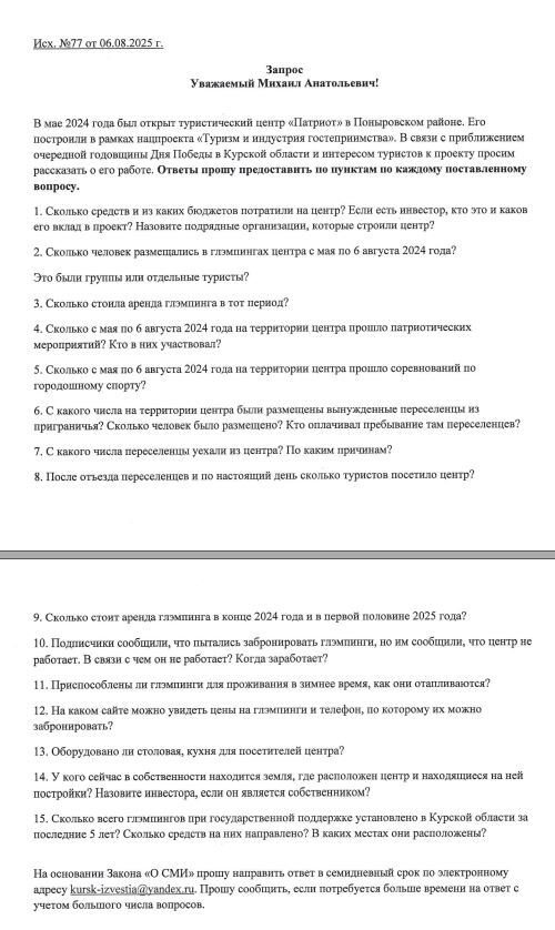 Если глэмпинги, построенные за бюджетные деньги на развитие труизма, не сдают, то здесь может быть нарушение условий нацпроекта, подумали мы. По соглашению получатель субсидии три года с момента запуска проекта обязан принимать туристов. Поэтому мы написали официальный запрос в правительство области.