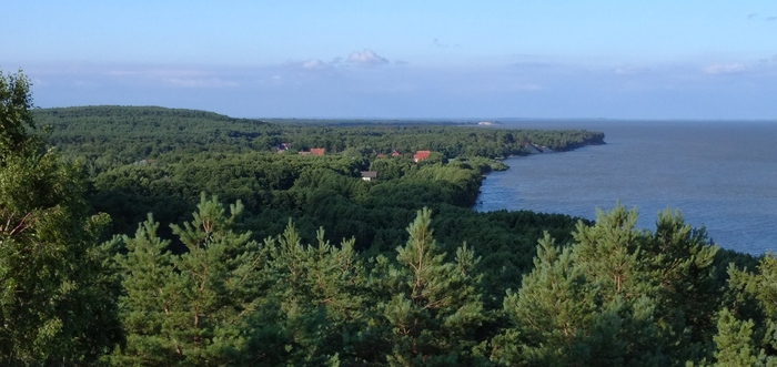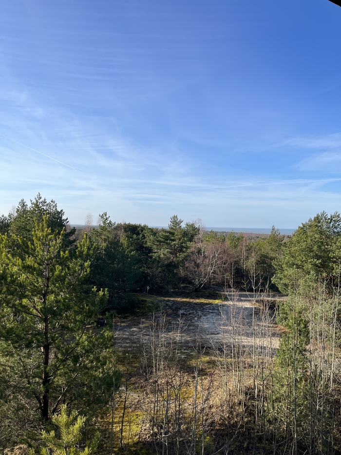 Первая остановка — высота Мюллера — самая широкая часть суши на косе: из густого леса мы поднимаемся вверх и чем дальше двигаемся, тем больше появляется песка под ногами. И только с смотровой площадки понимаешь масштабы территории и колоссальный труд человека для поддержания косы.