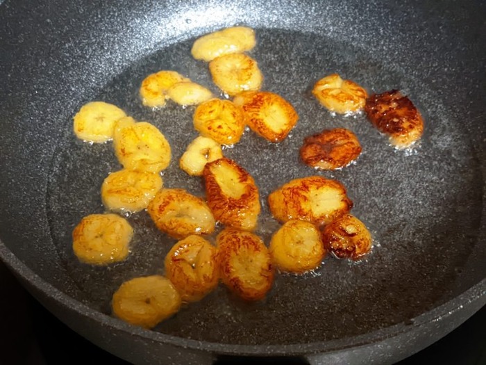 Нарежьте бананы кружочками, перец и ананас мелкими кубиками, мелко нарежьте кинзу и зеленый лук, натрите чеснок и имбирь натрите. В сковороде или сотейнике разогрейте кокосовое масло. Добавьте кружочки банана и жарьте их 2-3 минуты. Переверните бананы и жарьте еще 2-3 минуты. Выложите на бумажные полотенца.