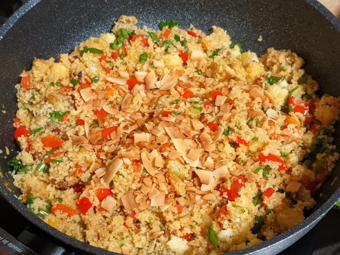 В ту же сковороду добавьте перец, банановый перец и ананас. Жарьте 3-5 минут. Затем добавьте натертый чеснок и имбирь и жарьте 30 секунд. Переложите все это в миску. В ту же сковороду влейте немного кокосового масла. Добавьте половину кускуса и перемешайте. Добавьте оставшуюся часть кускуса и жарьте все это в течение 3 минут. Влейте апельсиновый сок, соевый соус и сок лайма. Перемешайте и добавьте овощи и ананас. Снимите сковороду с огня. Добавьте жаренные кокосовые хлопья, кинзу и зеленый лук.
