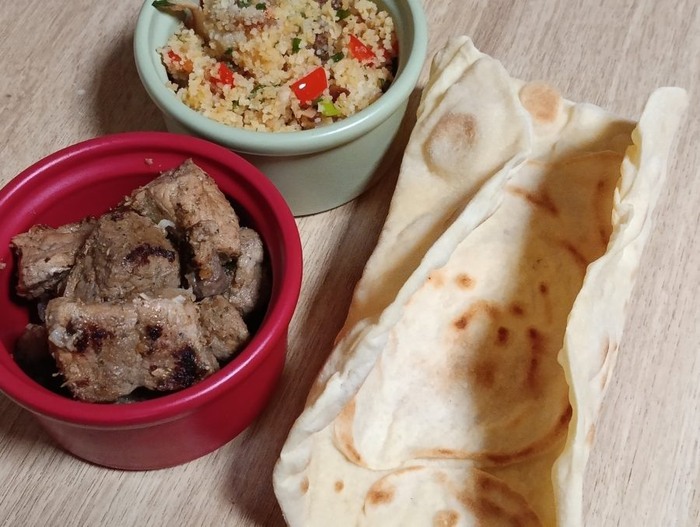 На свежий наан выложите кускус с фруктами и куски свинины с небольшим количеством соуса от тушения.