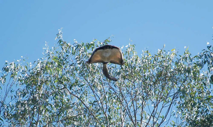 За первые два занятия пояснять не нужно, там всё как у людей. А вот на последнем остановимся подробней. По факту, всё тело нашего героя — одно сплошное крыло. Кожистая перепонка от локтей до коленей позволяет летать долго, а пушистый руль-хвост длиной в 60% от общей длины тулова помогает маневрировать и спасает от преждевременного торможения об дерево. Ко второму дню рождения габариты кускуса сравнимы с габаритами кошки: 1,5 кило веса, 90 сантиметров. Это самое крупное летающее сумчатое!