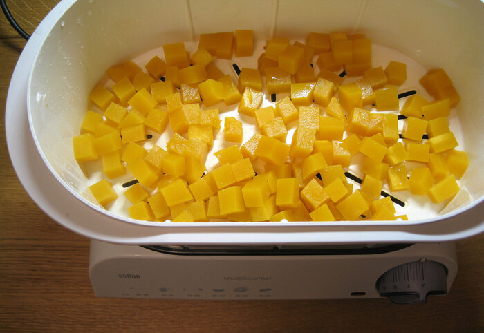 В это время тыкву, нарезанную мелким кубиком, готовим в пароварке в течение 15 минут.