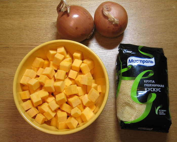 Заправляем бульон луком, тыквой и кускусом, доводим до кипения и снимаем с огня. Пока готовый суп закипает, доводим его до вкуса с помощью соли.
