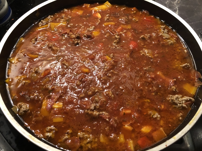 На растительном масле и сильном огне зажарить мелко нарезанные лук, чоризо и перец. Через 5 минут добавляем фарш, приправы и специи, уменьшаем огонь и закрывшем крышкой. Ещё минут через 5 добавляем бульон, томатную пасту и водку/шнапс. Ставим на средний огонь и даём большей части жидкости выкипеть.