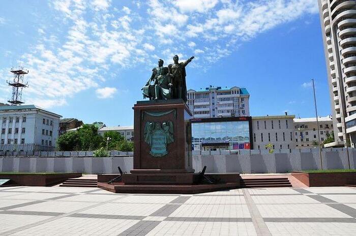 Адмирал Л. М. Серебряков, вице-адмирал М. П. Лазарев и генерал-лейтенант Н. Н. Раевский считаются основателями города. Монумент в их честь украшает центральную городскую набережную. Памятник состоит из трех бронзовых фигур, стоящих на 4-метровом гранитном постаменте. Плиты содержат надписи с ключевыми датами из истории Новороссийска. Издалека скульптура смотрится довольно масштабно.