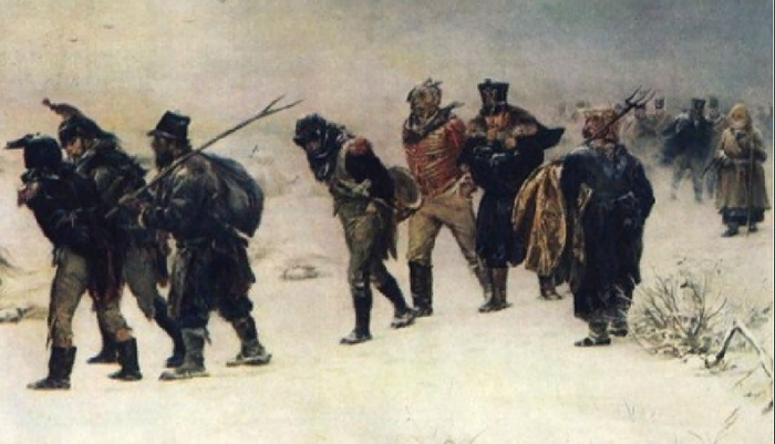 Здесь необходимо учитывать, что около половины армии состояло из рекрутов набранных в завоеванных странах (как вы понимаете, далеко не всегда добровольно). Одно дело победно маршировать от победы к победе по добрым европейским дорогам, от сытного обеда к сытному ужину и совсем другое, увязая по колено в грязище, на голодный желудок тащить на себе пушки и снаряжение из-за падежа лошадей, кутаясь при этом в обмотки от холода.