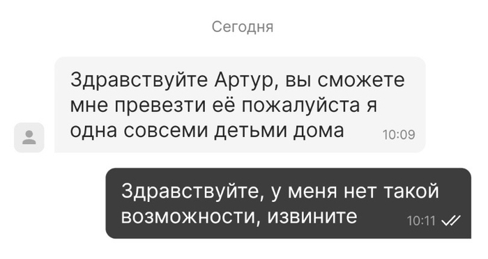 Помимо основной работы я занимаюсь обслуживанием компьютеров в свободное время. И как-то так получилось, что насобиралось у меня в гараже некоторое количество компьютерных корпусов, которые без блоков питания и вроде изначально были недорогие, но в хорошем состоянии, и их ещё можно применить для сборки другого компа: вкинул внутрь начинку - и будет комп! Дабы освободить немного место в гараже, я выложил с фото эти корпуса на Куфар за 10BYN каждый (280 RUB), с пометкой "Самовывоз". Пишет чел, и торгуется: давай, мол, за 5BYN я заберу? Я: Ок, забирай, приезжай к моему гаражу, я тебе его из двери отдам в руки за 5BYN (Мне то лишь бы избавиться от барахла, разгрузить гараж). Спустя время день он пишет, что он с другого города, но в моём городе будут проездом какие-то его знакомые, и не мог бы я подвезти на машине этот корпус этим знакомым? Я в ответ ему культурно сказал, что за 5BYN я не поеду на машине искать и подстраиваться по времени к его каким-то там знакомым. Пусть сами приезжают ко мне и от двери гаража забирают. И чел в итоге слился. Корпуса я потом отдал одному знакомому знакомых "энтузиасту", который любил возиться со старьём и чё-то там собирать-пересобирать б/у-шное.