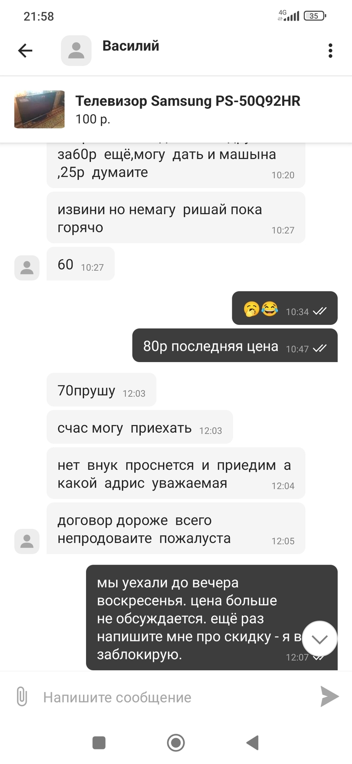 У меня вот так на куфаре нашем белорусском было. Продавала телек не рабочий 50 дюймов за чисто символические деньги. Так вынес мозг своими корявыми сообщениями да ещё и скидку дай. В итоге продала другому челу, который не задавал лишних вопросов и скидку не просил. Этот обиделся конечно, начал там неудачи желать и все такое. 😅 Хорошо, что у нас на куфаре не может кто попало отзывы оставлять, только тот, кто у тебя купил.