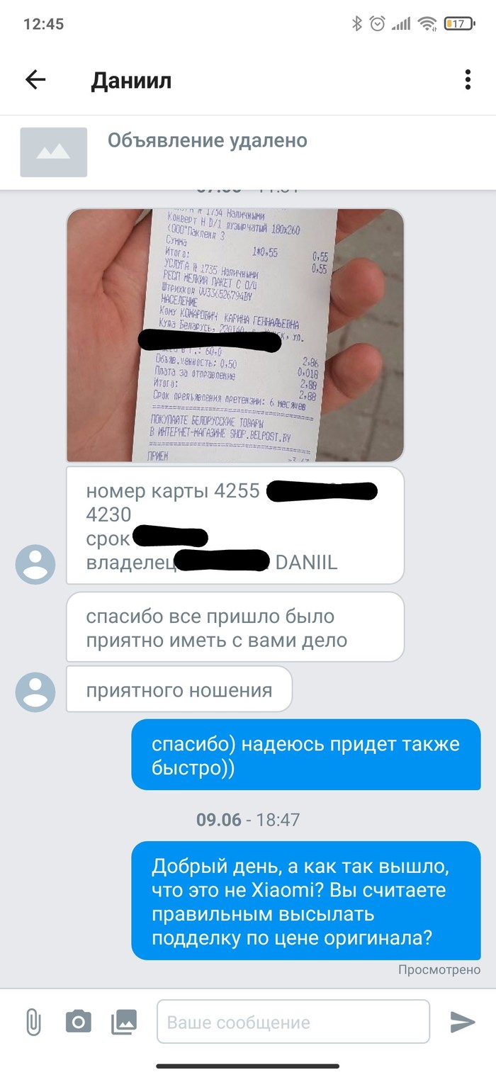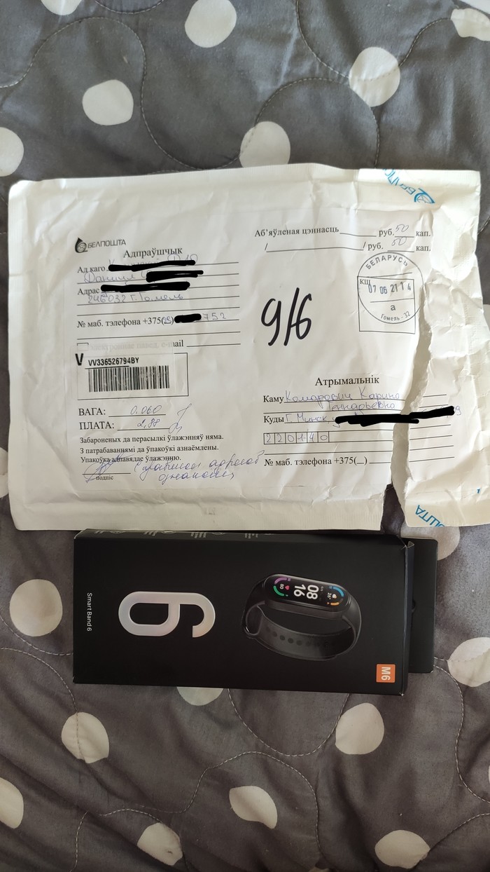 Я давно хотела приобрести браслет Xiaomi mi band 6. Мониторила цена на прощадке Куфар (действие происходит в РБ). 04.06 Увидела браслет за 90р в г. Гомеле. В объявлении было рекламное фото, что меня не смутило, так как подумала, что человек не хочет заморачиваться реальной фоткой. Мы как раз ехали туда на выходные, поэтому написала продавцу сразу понимая, что за такую цену быстро заберут (стоимость в магазине ~120р). Написала продавцу, он предложил пообщаться по телефону. По телефону сообщил, что на выходных он в Минске. Сказал, что браслет ему подарили, он новый, продает, так как ему не нужен. Сказал также, что это китайская версия. Спросила, чем она отличается - ответил, что ничем абсолютно, и сам он такую носит и сестре подарил, просто она дешевле. Я сама пользуюсь на данные момент 4 версией браслета и знаю, что есть глобальная версия и китайская, и что отличия незначительны для пользователя. Также об этот говорит Гугл. В итоге договорились об отправке почтой