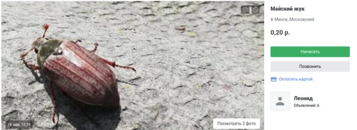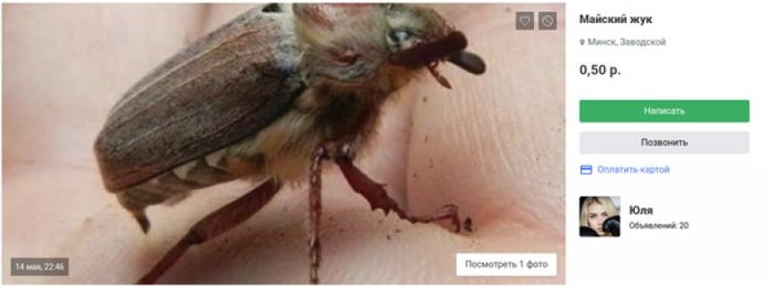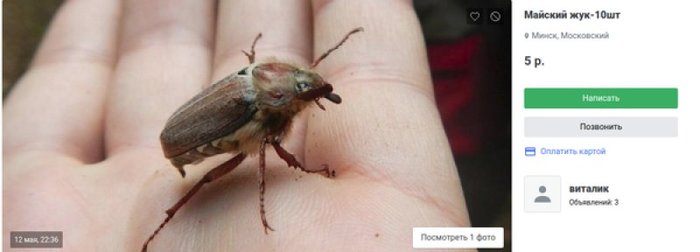 Цены на товар разнятся. Самых дорогих жуков ловят в Новополоцке — по 2 рубля за штуку. В объявлении автор пишет, что «майский жук новый, только что пойман». Но добавляет: «торг уместен».