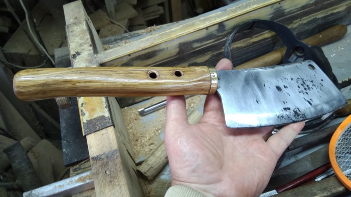 Из корневища дуба рукоятка, латунная обоймица из сантехнической муфты. Хвостовик приварил из куска первой попавшейся под руку железяки. Изначально хвостовик на ноже был короткий, поэтому при рубке замороженного мяса рукоятка сломалась, потом сломалась уже вторая рукоятка, по аналогичной причине. Уже решил радикально переделать и избавиться от неприятного дефекта, третья рукоятка надеюсь прослужит долго ))
