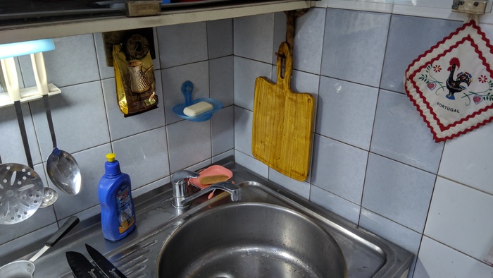 Висит на деревянном крючке, так чтобы капли после мойки стекали в мойку