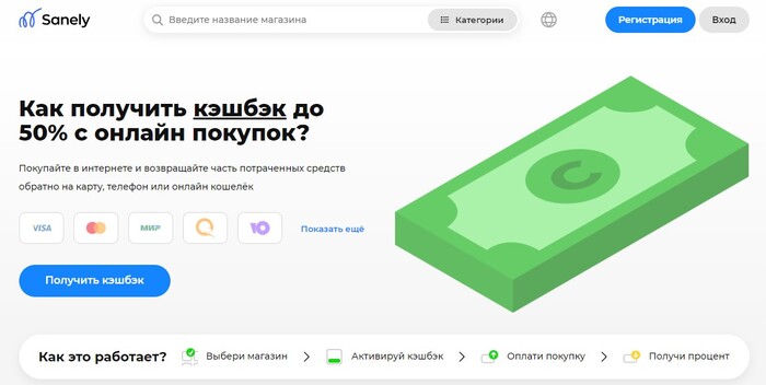 Кэшбэк-платформа, которая возвращает своим пользователям до 50% от их заказов на популярных маркетплейсах. Партнерами «Sanely» являются такие известные магазины и сайты, как Aliexpress, re:Store, МегаМаркет, Золотое Яблоко и так далее. Для удобства навигации все товары с кэшбэком разделены на популярные категории: «Автомобильные товары», «Одежда, обувь и аксессуары», «Красота и здоровье», «Игры» и т. д. Как и у многих похожих сайтов, в «Sanely» есть своя реферальная программа, с помощью которой можно извлечь еще больше выгоды от приглашенных в сервис друзей и пользователей.