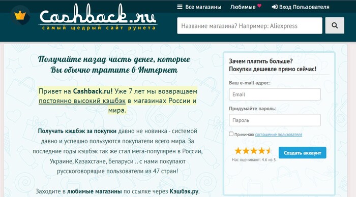Один из самых старых сервисов, который работает на территории России, Беларуси и других стран уже более 7 лет. Партнерами «Кэшбэк.ру» являются более 700 магазинов с разными товарными категориями. Максимальный размер возврата за онлайн-покупку через сервис может составлять 90%. Несмотря на довольно устаревший дизайн сайта (что вполне обусловлено его давним основанием), разобраться в интерфейсе очень просто: все нужные разделы находятся на главной странице.