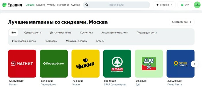 Известный и узкоспециализированный отечественный сервис, который помогает искать самые выгодные предложения преимущественно в продуктовых магазинах. Дополнительно на сайте «Едадила» доступны и другие категории с кэшбэком: «Компьютерная техника», «Оборудование для ремонта и строительства», «Электроника» и так далее. Кэшбэк начисляется на внутренний баланс аккаунта, вывод доступен на электронные кошельки и номер телефона. Отличным бонусом за пользование услугами «Едадила» являются персональные промокоды, которые позволяют увеличить выгоду от покупок.