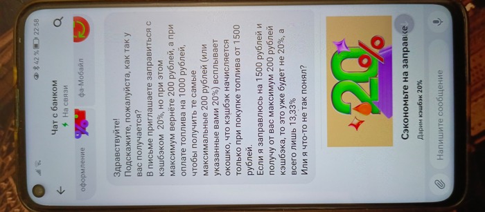 - Это ошибка оператора в чате и действительно можно получить 20% кэшбэка в размере 200 рублей, потратив 1000 рублей за топливо на АЗС Газпромнефть или у банка такие хитрые и/или математически одаренные маркетологи?