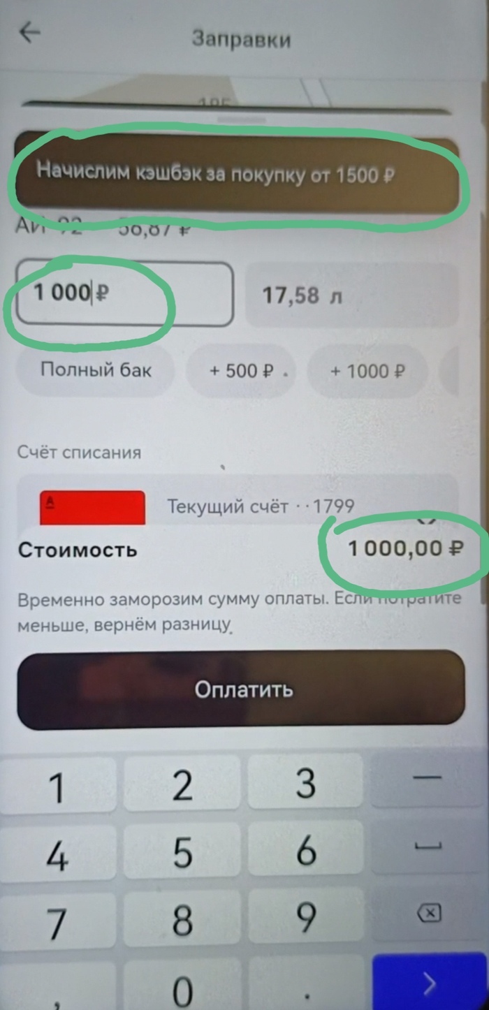Однако по факту условия игры поменялись. Через сервис "Заправки" приложения Альфа-Банка я уже дошел до ввода номера колонки и суммы оплаты в размере 1000 рублей, как вдруг на экране высвечивается информация, что кэшбэк начисляется только за покупку от 1500 рублей.
