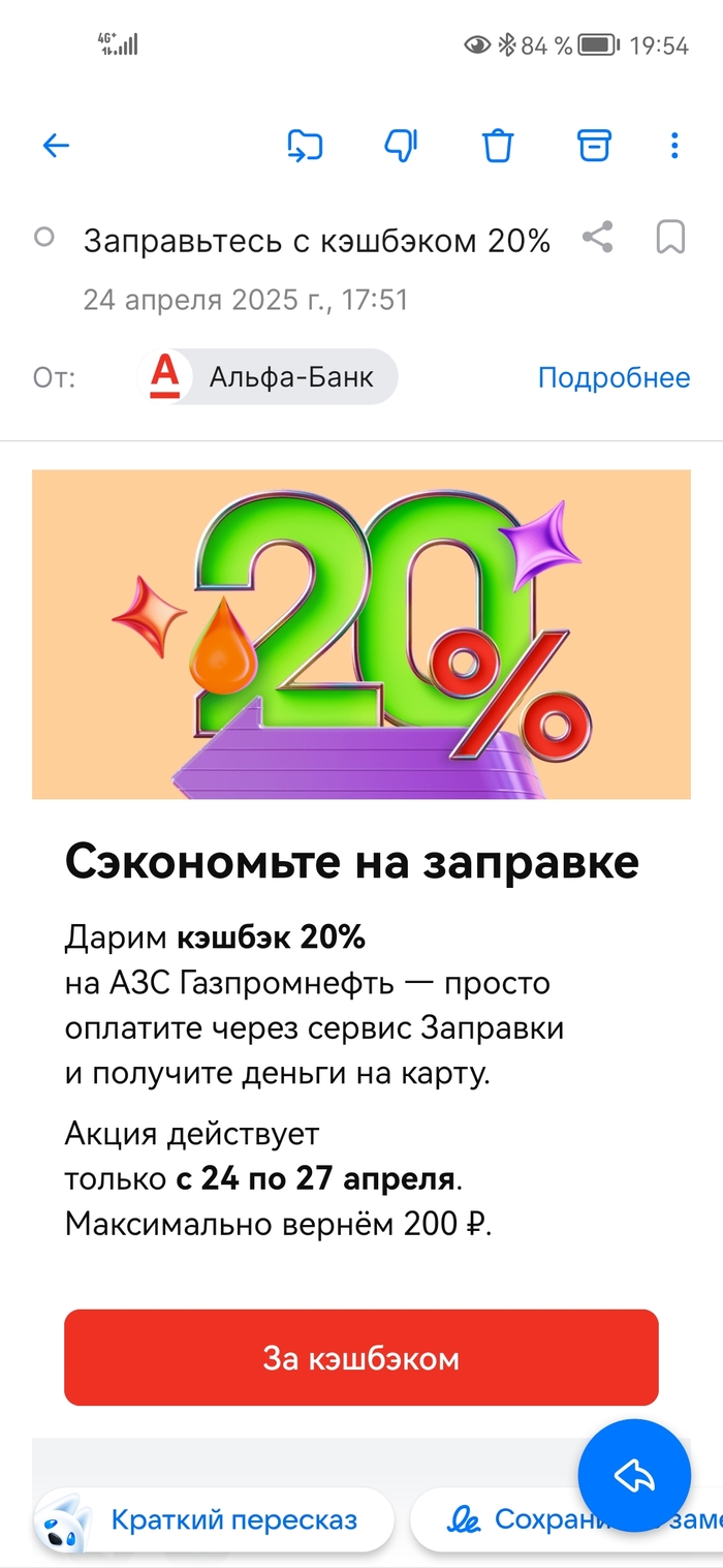 На днях пришло мне письмо от Альфа-банка с предложением сэкономить на топливе. Банк дарит 20% кэшбэка при заправке на АЗС Газпромнефть в период с 24 по 27 апреля и при этом обещает вернуть максимум 200 рублей.