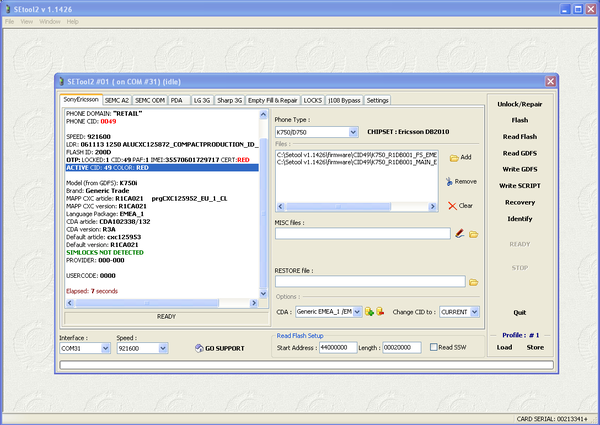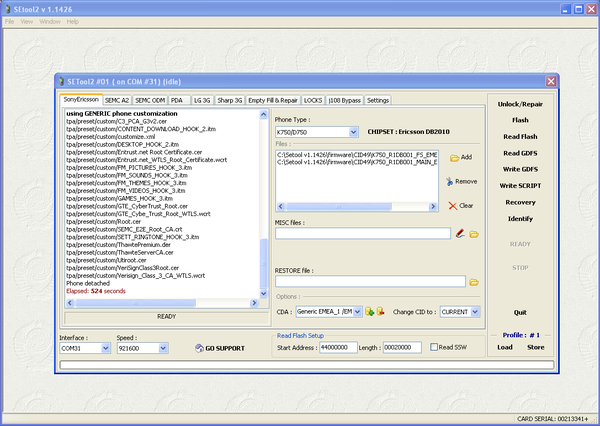 Выбираем наш телефон из списка, K750 располагается на первой вкладке. В левом нижнем углу, выбираем COM порт, на котором висит наш бокс. Жмём Identify, подключаем телефон к боксу с зажатой клавишей C.