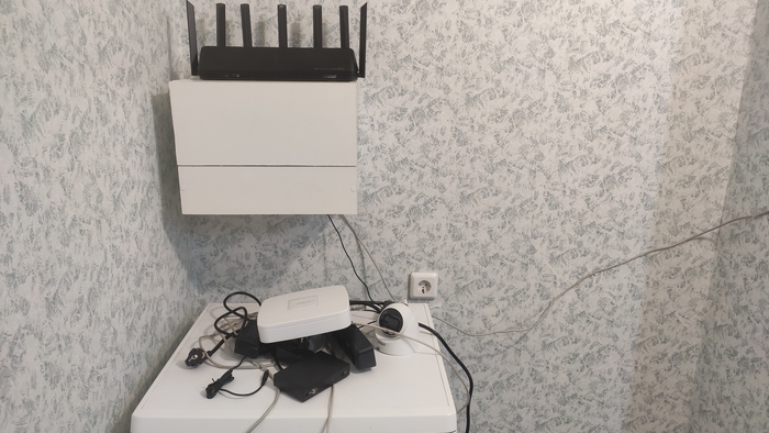 Место для установки было выбрано следующее, но чтобы куча устройств не мешалось и можно было аккуратно подключить в удлинитель, решил установить шкафчик. Промониторил Авито и маркетплейсы, пришел к выводу, что ящики которые там продают, будут слишком большими, кроме того у меня остались обрезки после прошлых самоделок. Решил делать сам. Исходя из количества материала и отсутствия желания лишний раз пилить лобзиком (такие распилы уступают распилам на циркулярке) была придумана форма и прикинуты размеры. Задумка была простая: короб без задней стенки и одна крышка, открывающаяся вверх, чтобы не отходила, так как пользоваться ей придется раз в полгода если не реже.
