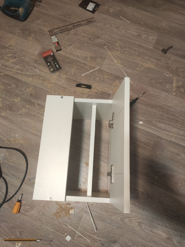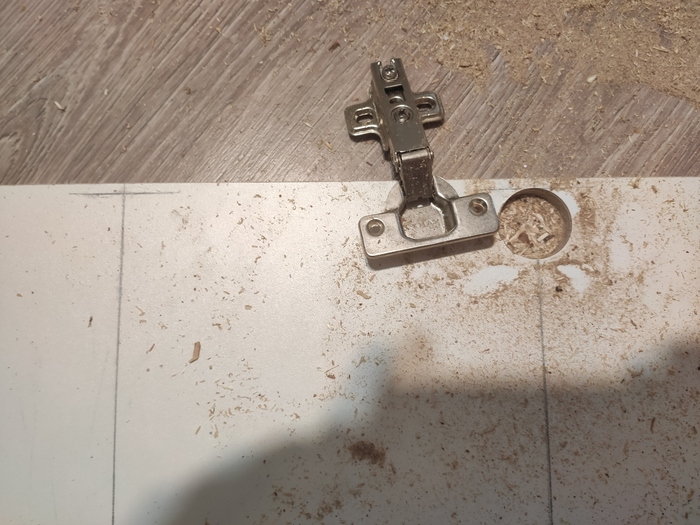 Крепим петли, проверяем, настраиваем петли и доклеиваю кромку там, где она нужна (на торцах боковин, ставших видимыми после сборки) (забыл сделать фото).