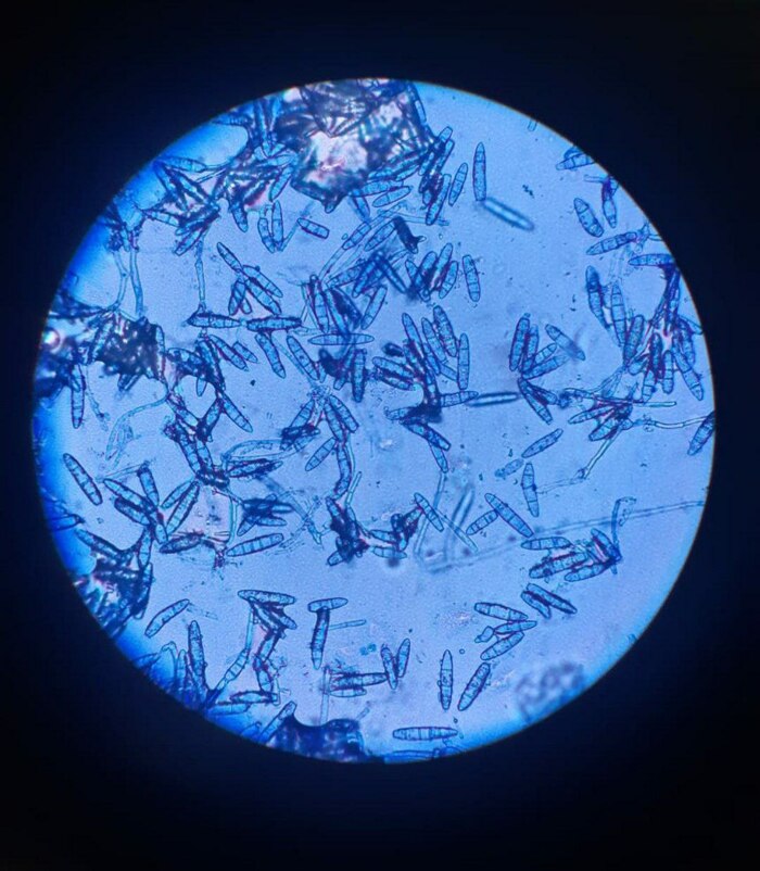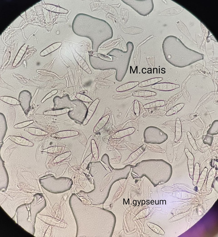 Вообще, есть 30+ видов грибов, но мы рассмотрим всего 3, наиболее распространенных, которые способны вызвать заражение животного. Посмотрим, как это выглядят под микроскопом. Искать будем макроконидии - зрелые формы спор. По методике, макроконидии можно увидеть под маслом или красителем. В данном случае применялся метиленовый синий.