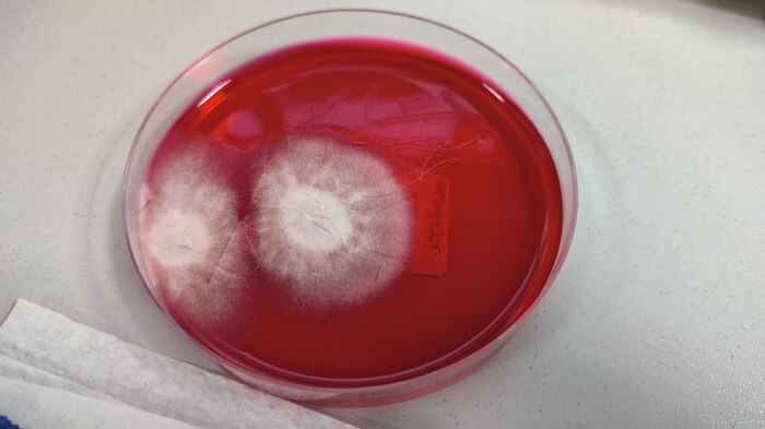 И вот тут мы подходим к более совершенному методу исследования - а именно к посеву шерсти на селективные среды для проращивания дерматофитов. В лабораторию поступает шерсть в контейнере, мы переносим её на среду, после чего среда помещается в термостат, где ей тепло и уютно расти :3. Смотрим за ростом среды в течении 21 дня. Каждые 3 дня врач проверяет рост и если появляется характерный рост, то эту среду мы забираем на микроскопию. Вникать в методику не буду, просто посмотрите, как выглядит подозрительный рост: