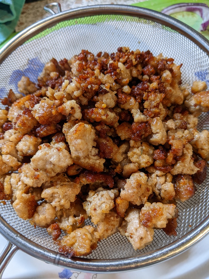 По готовности фарша (обычно жарю примерно 25 мин) я его переложил в ситечко, чтобы лишнее масло и жир стекли