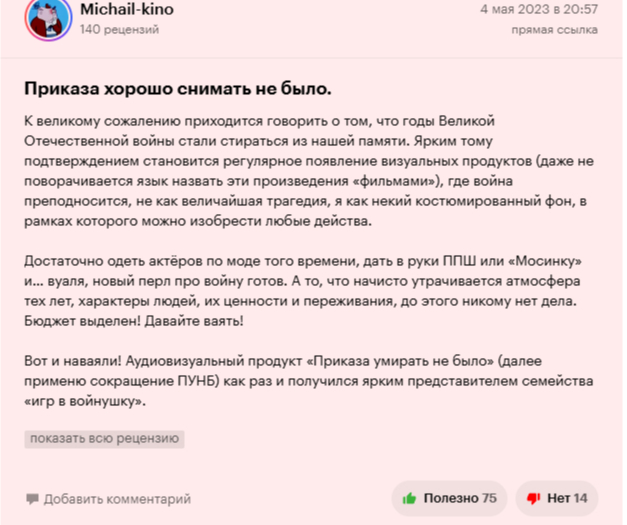 "Какая нехватка самолётов? К 1944 году остро не хватало лётчиков, а самолёты нам поставляли и союзники и родной авиапром в достаточном количестве. История противостояния Яка и Мессершмита вообще ни о чём. Самолёты были под разные задачи, Як во всех модификациях был самым массовым в нашей армии, почти по всем основным показателям истребителя уступал актуальному мессеру почти всю войну, но со своей основной задачей справлялся на отлично. Наши же асы заканчивали войну на ла и кобрах. Когда уже наконец за такое кино начнут не просто критиковать, а наказывать? Это же надругательство над памятью героев войны."