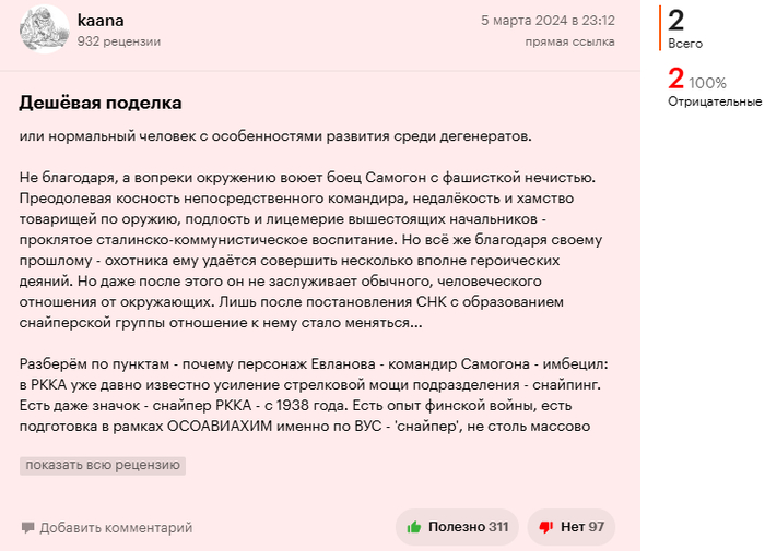 Отзыв верный - "Даже давай по картинке пробежимся....смотрел "Они сражались за Родину"? Вот там показаны казачьи места и казачья архитектура, уклад, одежда тех лет. Что нам показал говнорежиссер? То на чем он денег попилил! Леса Подмосковья, рубленые избы, которых отродясь не было на Дону, какую то банду в разношерсном обмундировании без знаков различия и не бритых неделями. Это в РККА такое было? Посмотри фотографии тех лет, где казаки носят форму. Все по уставу Расскажи нам, где казаки с 1924 по 1941 детей своих учили воинскому делу? Откуда шашки и прочее вдруг взялись у органов вопросов не было? И почему шашки половина драгунские? Про кресты так вообще молчу! Прабабка кресты прадеда в нужнике утопила, чтоб только не пришли за прадедом в конце 30-х. Офицером при царе прадед был. Нам опять налили полное ведро клюквы и украли выделеные от государства деньги! Полицаи белорусские откуда на Дону нарисовались? Я дальше второй серии смотреть не смог. Там наверняка еще больше дерьма сняли".