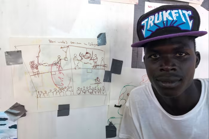 Спасенный мигрант по имени Адам позирует рядом со своим рисунком сцены пыток в комплексе Бани Валид в Ливии © Annie Chaon/AFP/Getty Images