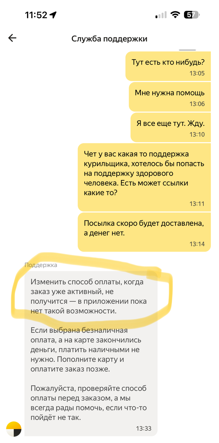 Поддержка Яндекса ответила, что после начала заказа я не могу изменить способ оплаты. Какого хрена, Яндекс??? Я чуть не рехнулась доставляя ценный груз из точки А в точку Б. Просто потому, что оператор поддержки сказал, что я могу изменить способ оплаты в любой момент.
