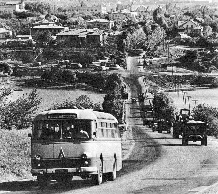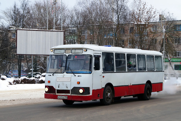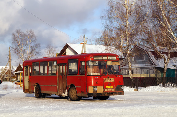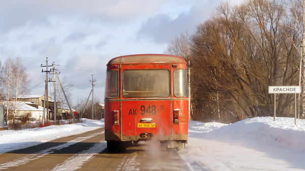 Красный ЛиАЗ-677 въезжает в деревню Красное
