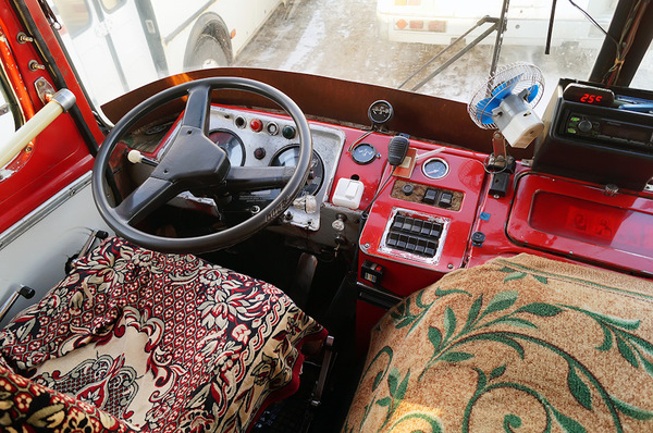 В кабине — простой ЛиАЗный шик: удобный руль от Икаруса, одеяло на капоте, служащее для шумоизоляции, вентилятор и ''розочки'' там и тут. Бытовой выключатель — вместо пневматического крана управления дверьми, который находился под левой рукой водителя, в углу. Отдельно отмечу — машина на пропане, о чём говорит пультик ГБО под блоком кнопок.
