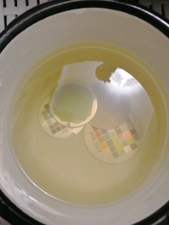 Спустя несколько дней практически рефлекторно во время утренних банных процедур я взглянул на содержимое «батиного супа». Каково же было мое удивление, что то самое изображение, выполненное на «неправильном» режиме осталось без единого следа коррозии.