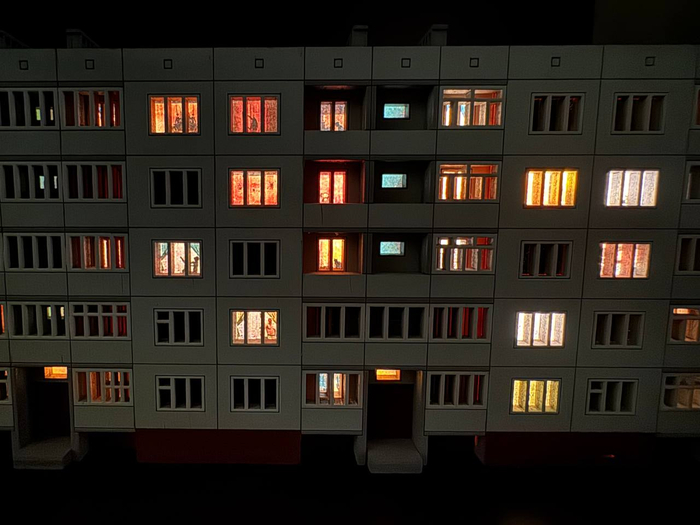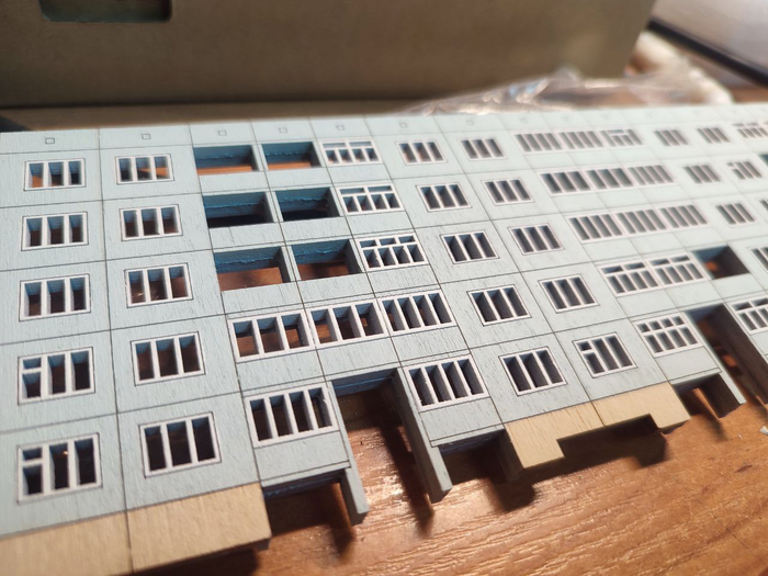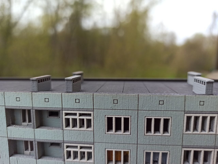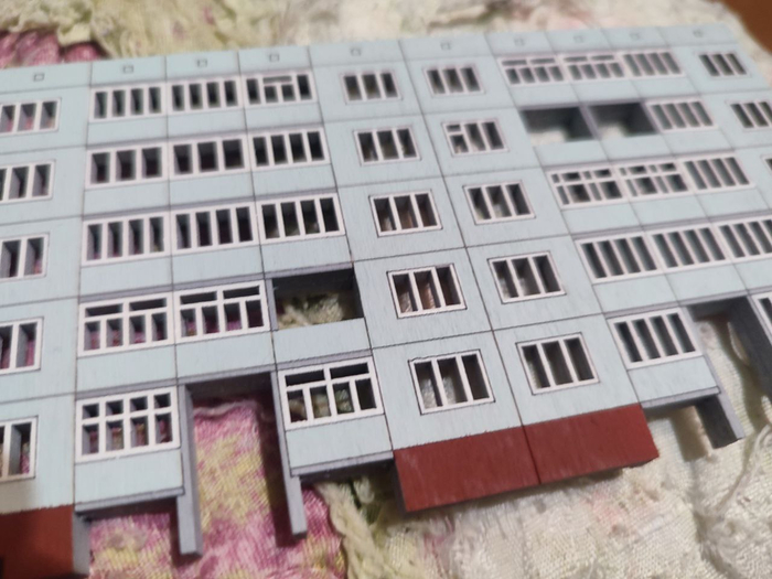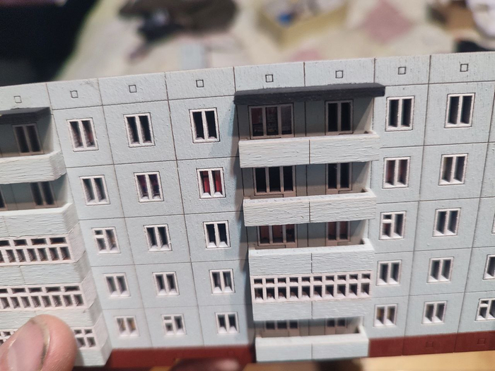 Высота окошечка всего 8мм, а ведь все рамы нужно покрасить. Плюс у подъезда и лоджий нужно выдержать объем, чтоб не было просто приклеены панели имитации лоджий и балконов.
