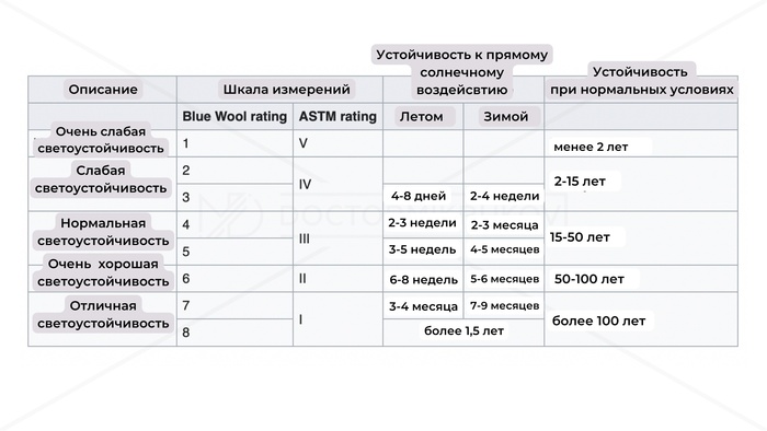 Blue Wool rating — это таблица светоустойчивости красящих веществ (колорантов). Изначально эту систему разработали для окрашивания тканей, но сейчас она применима и к другим колорантам.