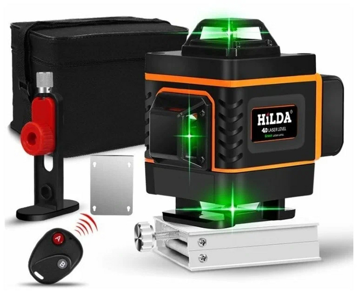 Лазерный уровень HILDA 3D нужно несомненно отнести к бытовым нивелирам, хотя заявленная точность у него на уровне профессиональных приборов. Три плоскости по 360°, зелёный цвет лазерных линий, тонкие линии, на 10 метрах толщина линии составляет чуть меньше 3 мм, маленькая погрешность, питание от аккумулятора и неплохой выбор по комплектации. Ссылка на Алик.