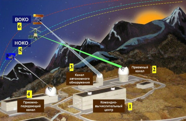 Лидарный комплекс «Крона». 1: центр управления и вычислений, 2: узкоугольный телескоп, 3: широкоугольный телескоп, 4: лидарная система, 5: низкоорбитальные спутники, 6: высокоорбитальные спутники.