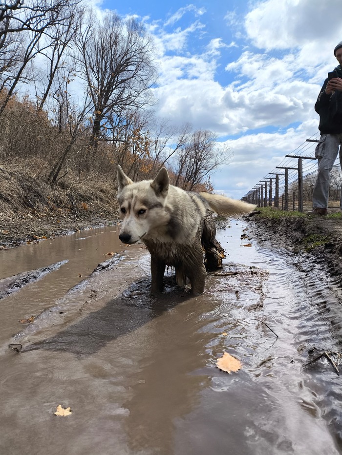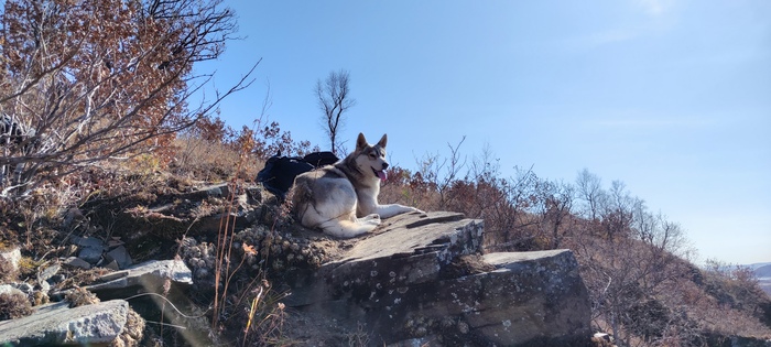 В 2023 году в походе на Михайловские столбы (памятник особого значения, одно из семи чудес Амурской области) Мы познакомились с собакой из соседнего карьера, собаку зовут Гром и он не прочь увязаться за людьми в поход, естественно он хочет вкусняшек и почесаться☺️
