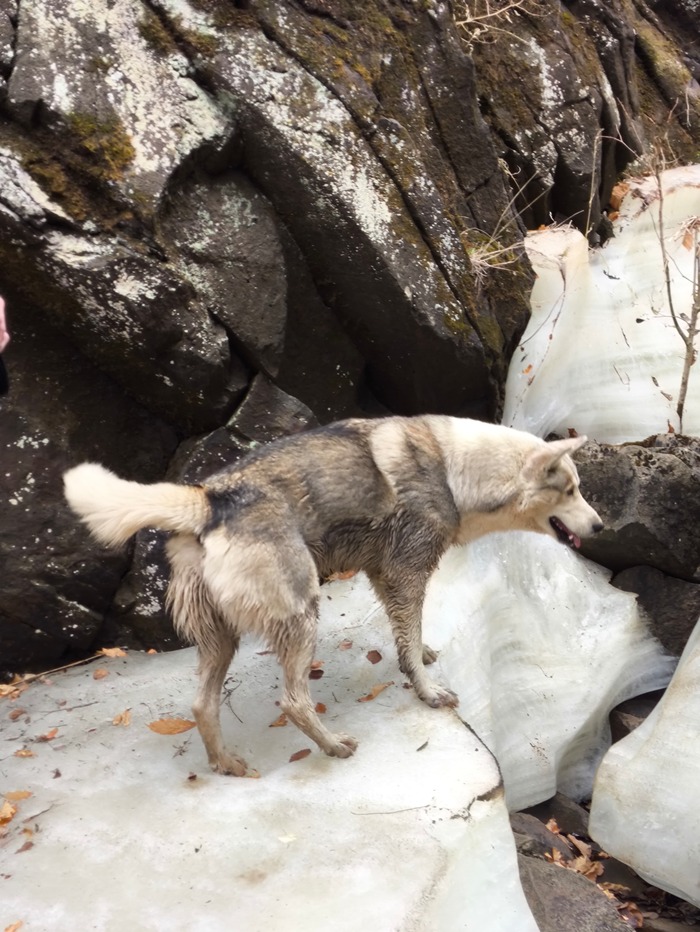 Кстати он немного заскулил что ледник скользкий, но все равно из-за некого любопытства прыгнул на лёд и забирался по скользкому пути вверх, там и застрял, не смог выйти, я его потом вывел и уже обратно он довел нас до основной тропы вверх на сопку и смещался с другими туристами...