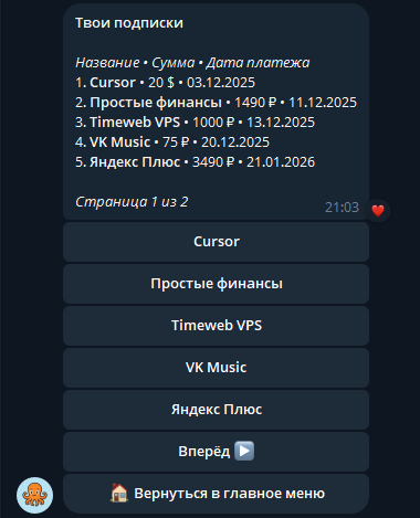 На создание подписки уходит 15–20 секунд. И всё — дальше Subby сам будет мягко напоминать, без спама и лишних сообщений