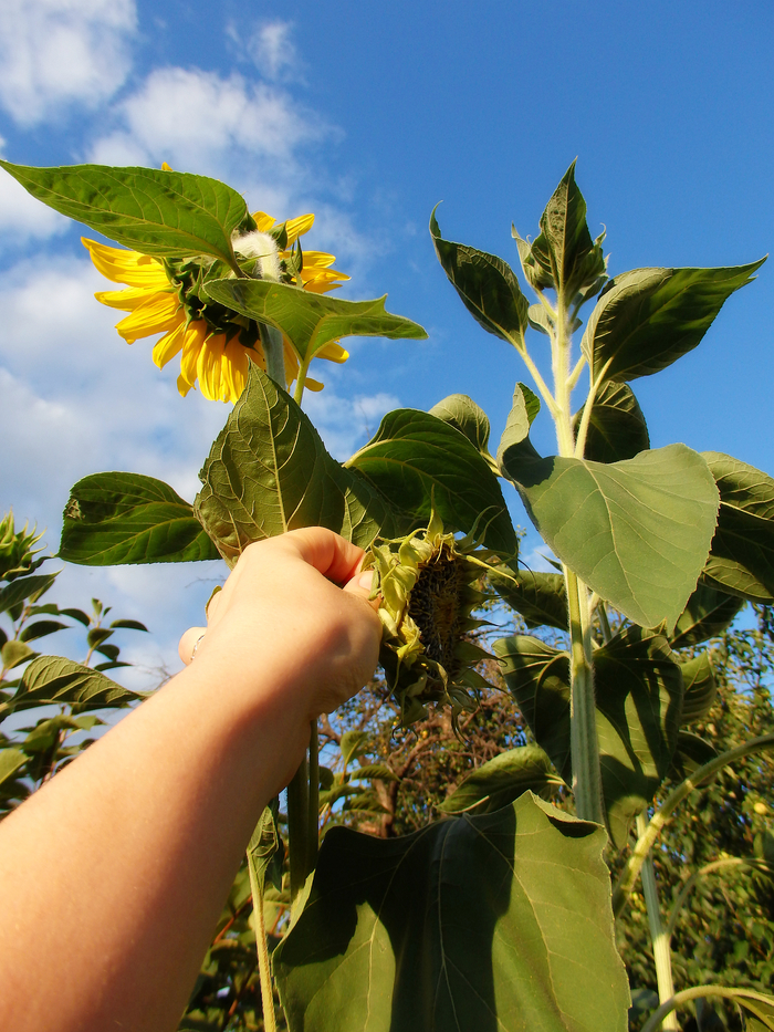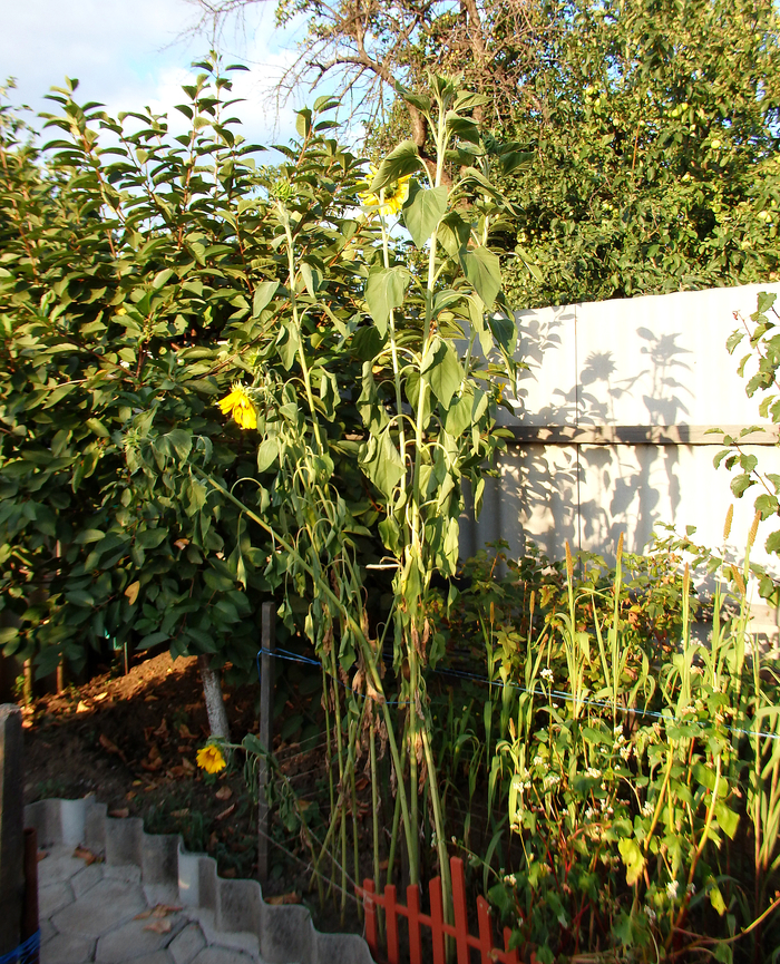Подсолнечник. Посадила буквально с десяток зерен белых и полосатых на молодые семена в корзинках, все взошли и вымахали под два метра, хотя сами "шапки" довольно мелкие.