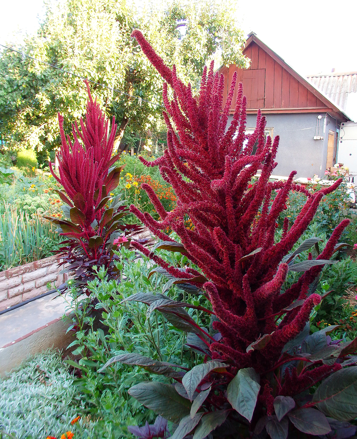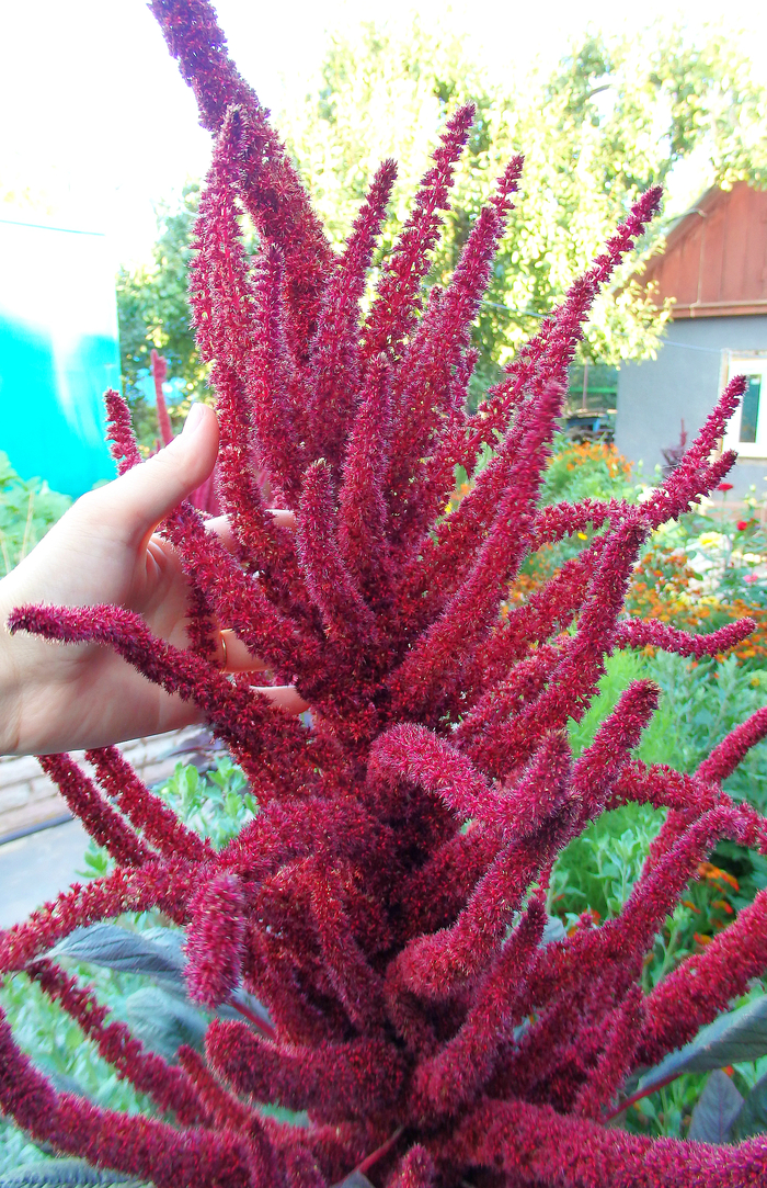 Амарант. Сажаю своим птицам уже второй год, растет по одиночке, особого ухода не требует, любит влагу и солнце. С трех таких метелок получает неполный стакан семян, также даю метелки частями, птицы очень любят копаться в них и выбирать семена.
