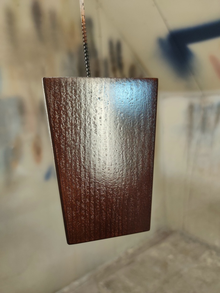 С прошлого заказа остался ПУ лак (200грамм) и он подходит по заданному заказчиком блеску в 30%. Материал очень прочный, тиксотропный, с средним сухим остатком. Его лучше не наносить на белые эмали и светлую древесину, т.к. он даёт небольшую желтизну, плюс со временем ещё более желтеет. В данном случае это не играет роли)