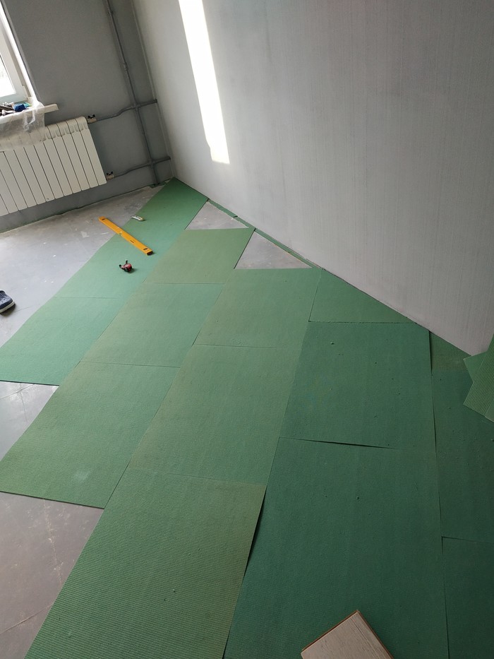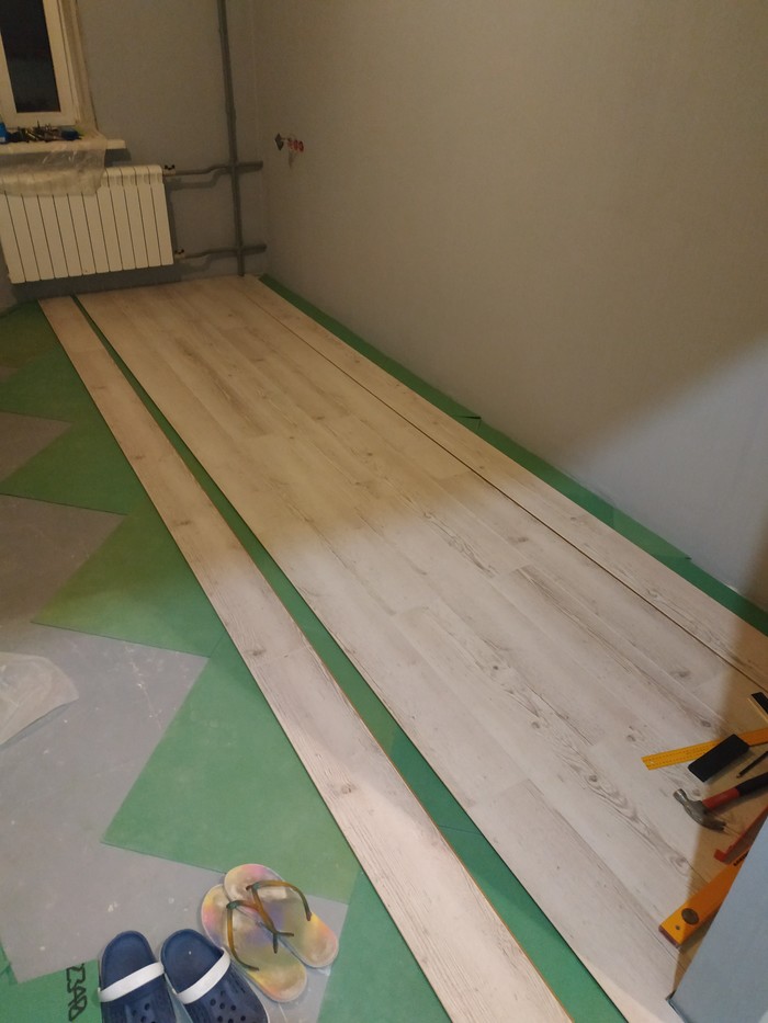 - Для того, чтобы определить готово ли основание к укладке -накройте на ночь фрагмент пола пленкой и оставьте ее до утра. Если утром на пленке не будет конденсата, то основание готово к монтажу