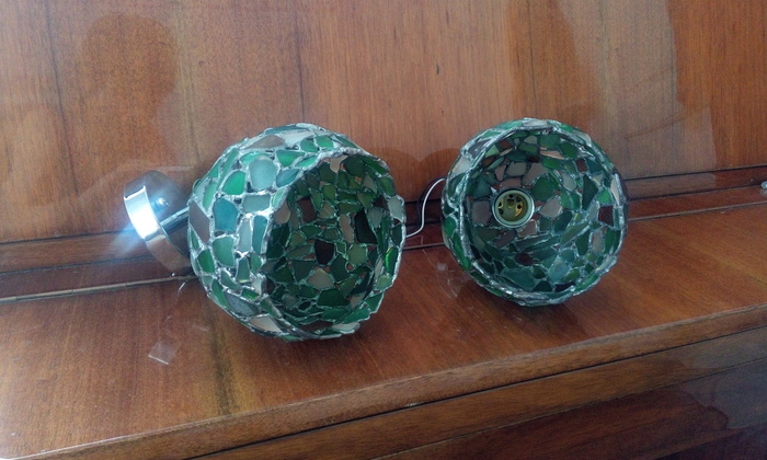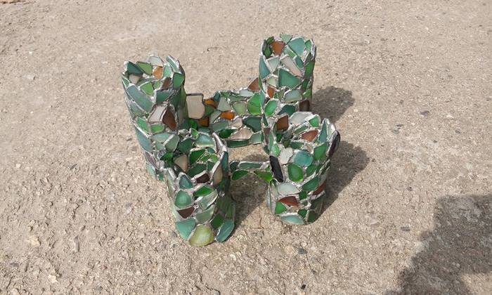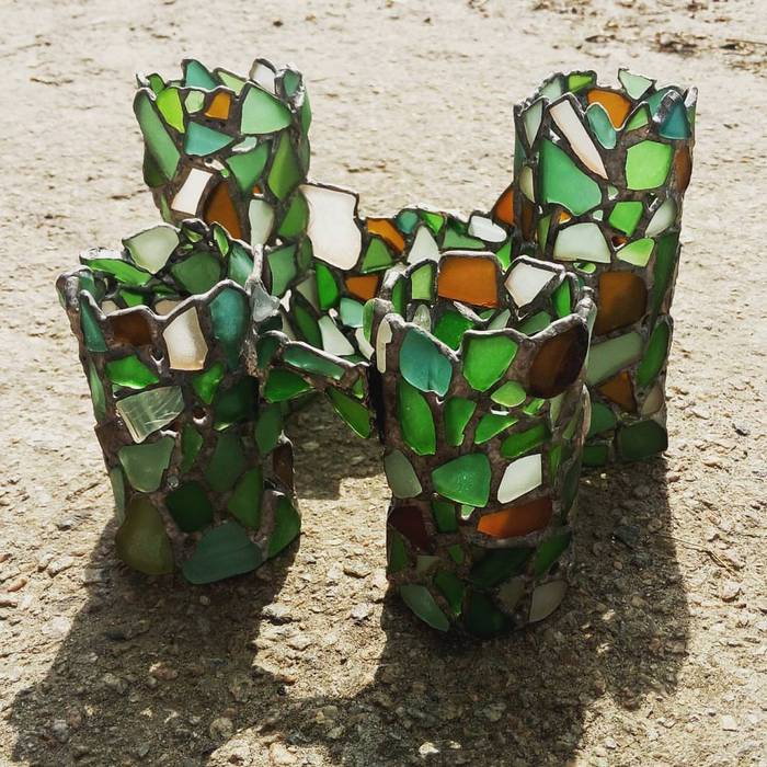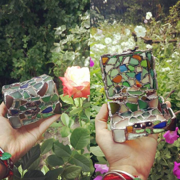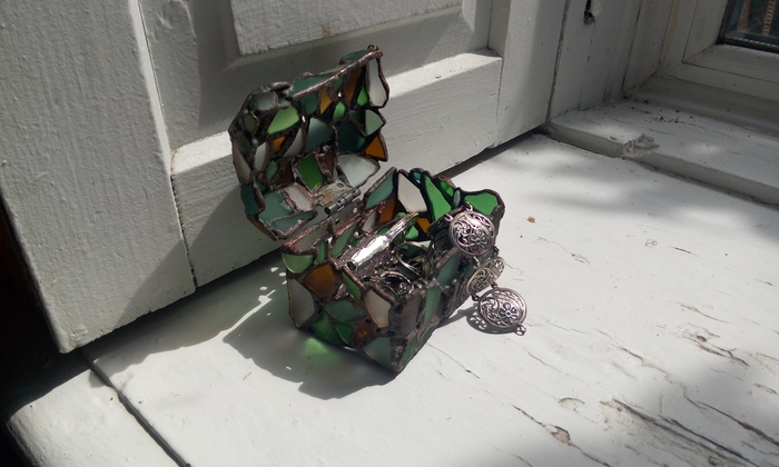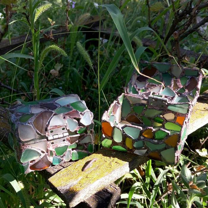Очередные фоторамочки. Если совсем честно, то подобное проще, наверное, сделать при помощи прозрачного и не-желтеющего клея. Но коль уж я паяю витражи и у меня все есть, то лично мне проще не экспериментировать и сделать витражные. В этот раз добавила и керамические осколки, и ракушки.