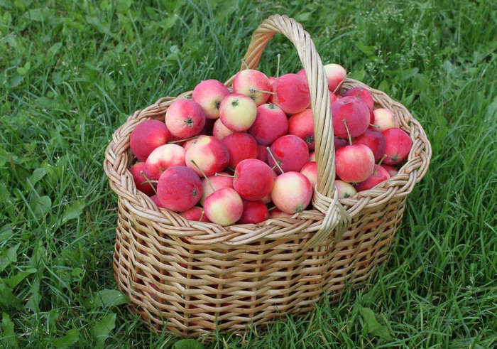 Хозяйка собирает прекрасный урожай с плодовых деревьев.