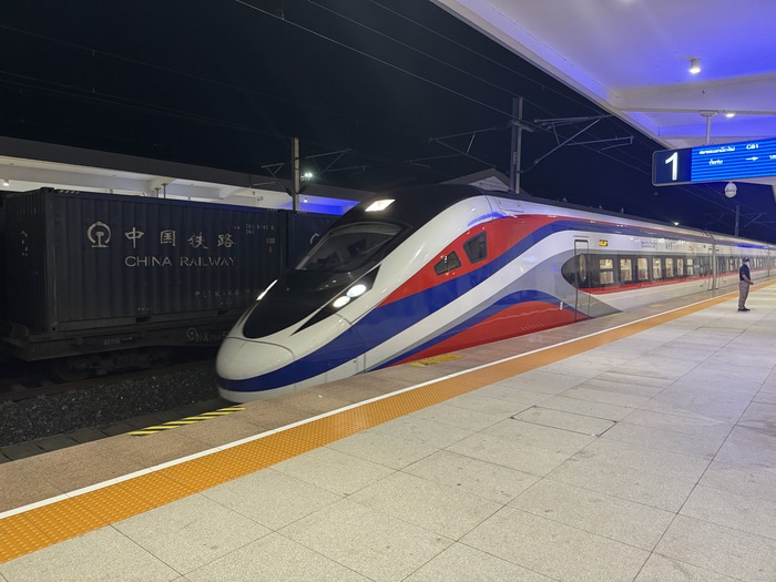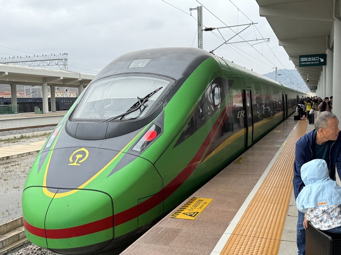 Внутри Лаоса ездят абсолютно те же самые CRH2, но уже не в китайской зеленой раскраске, а в цветах лаосского триколора